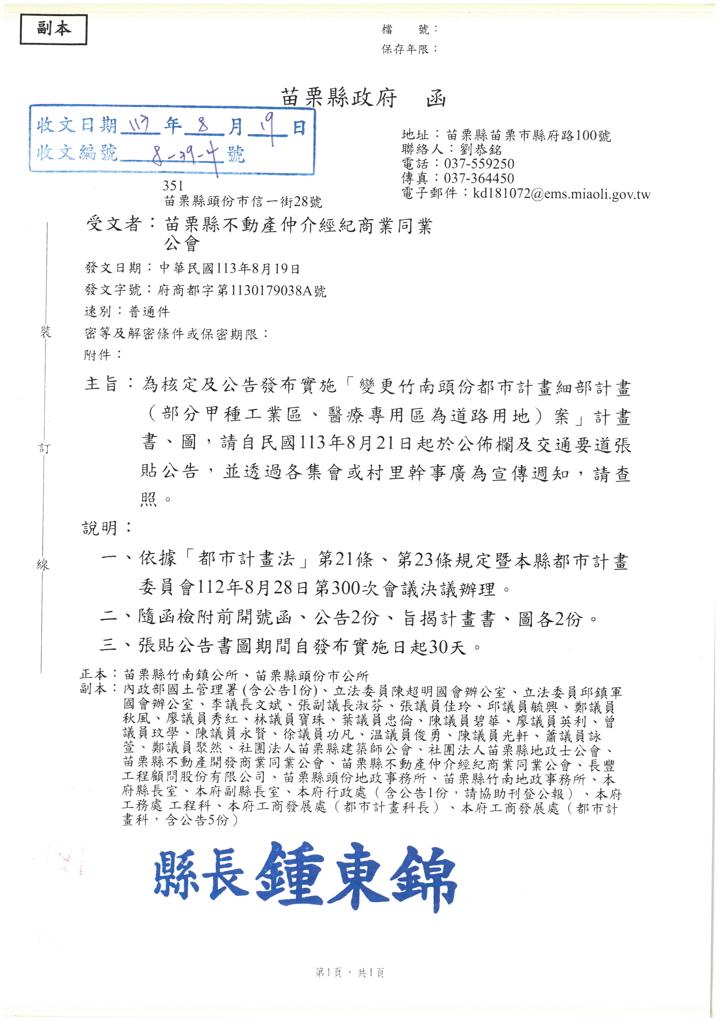 » 為核定及公告發布實施「變更竹南頭份都市計畫細部計畫(部分甲種工業區、醫療專用區為道路用地)案」計畫書、圖,請自民國113年8月21日起於公佈欄及交通要道張貼公告,並透過各集會或村里幹事廣為宣傳週知,請查照。
