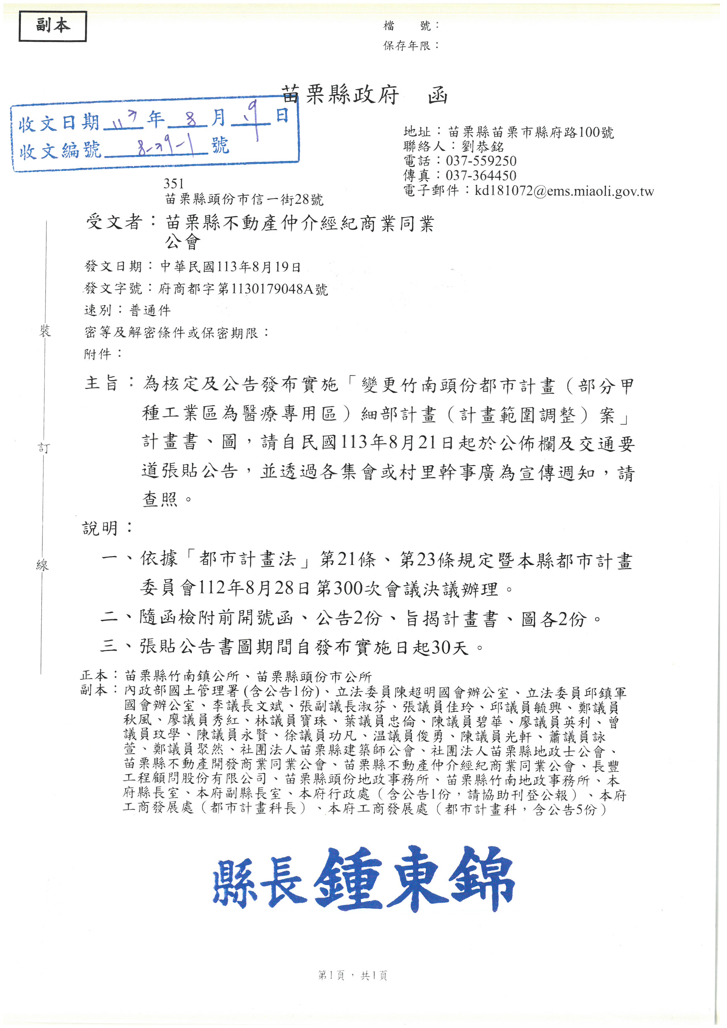 » 為核定及公告發布實施「變更竹南頭份都市計畫(部分甲種工業區為醫療專用區)細部計畫(計畫範圍調整)案」計畫書、圖,請自民國113年8月21日起於公佈欄及交通要道張貼公告,並透過各集會或村里幹事廣為宣傳週知,請查照。