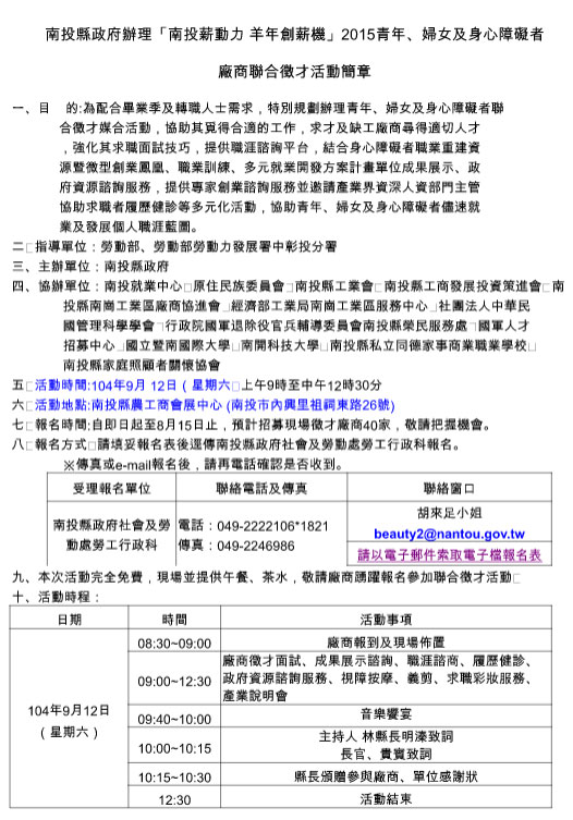 南投縣政府辦理「南投薪動力 羊年創薪機」2015青年、婦女及身心障礙者