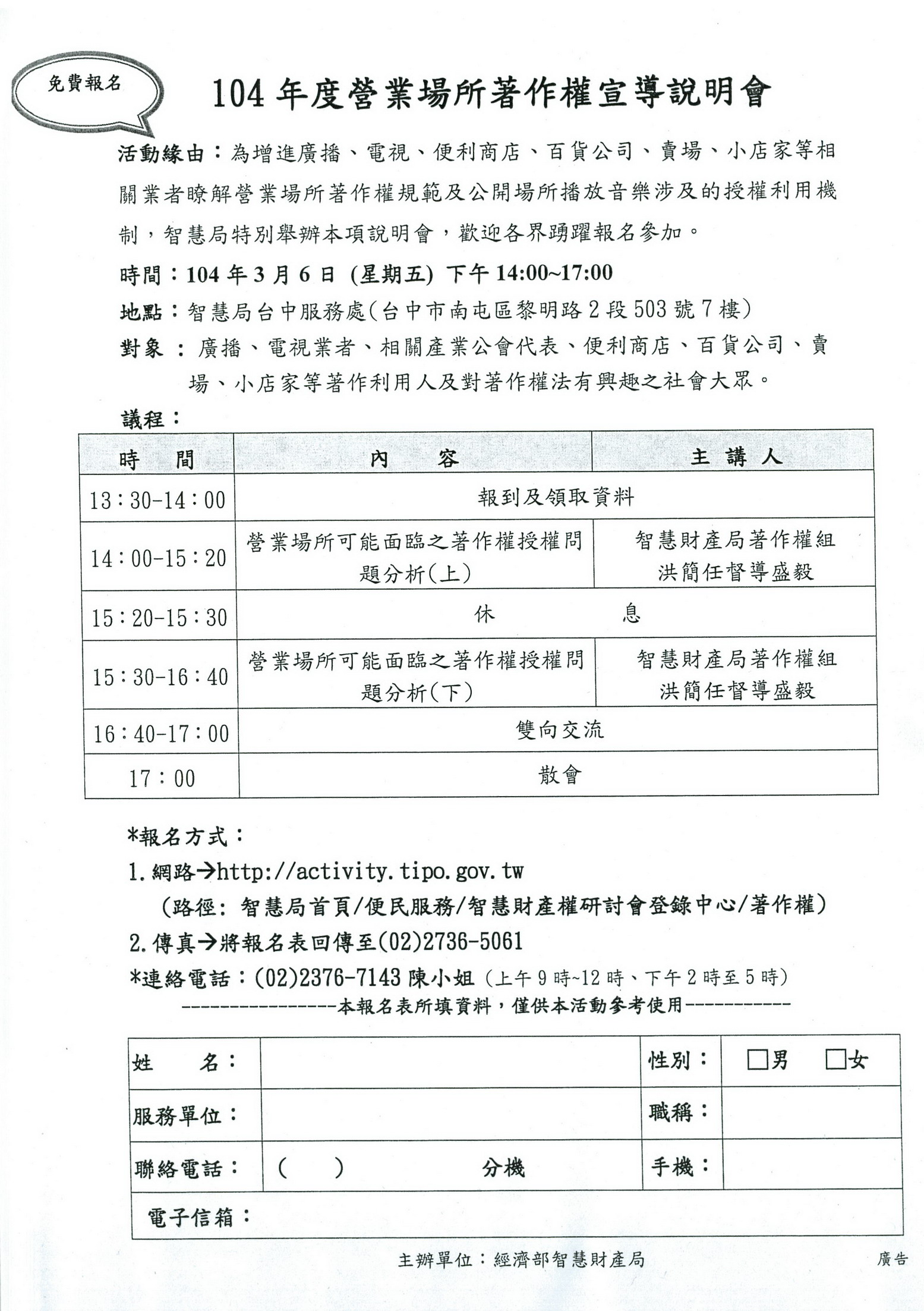 104年度營業場所著作權宣導說明會3/6(五)14:00- 17:00於智慧局台...