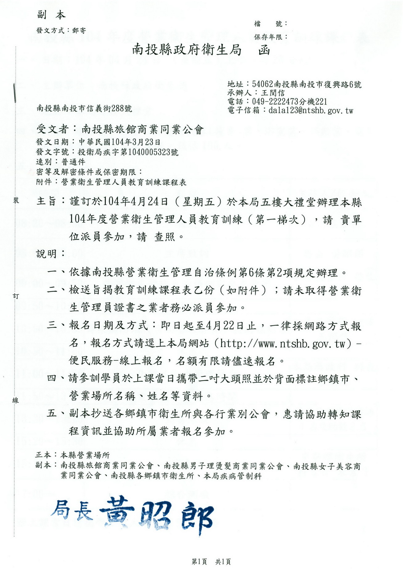 4/24衛生管理人員訓練於南投衛生局5樓 ,請會員踴躍報名參加