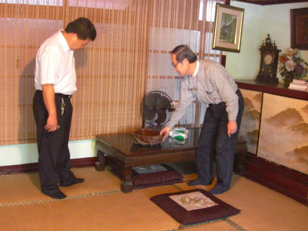 在日治時代有一房間是專門留給日本皇室來訪時住宿的行館,整個房間的樑柱沒有釘一根釘子,全部以木栓結合,房間造型更是參考日皇居所的規定建造,如以松樹、茶花的圖案雕製的精緻門窗,內部裝璜用的木料也採用花樟木與檜木等非常高級的木材。利用二根櫸木做為支柱將壁龕隔而為三;左邊上方是漆以生漆的竹編夾板,只要用手一頂,就可翻開,內藏有二隻武士刀,有密道可通往護衛官的房間,以防主人招受偷襲;左下方是一個大的櫃子,做為寢具存放之處;壁龕右邊的底板則是用三片大塊花樟結合而成,感覺非常典雅並具有歷史價值。