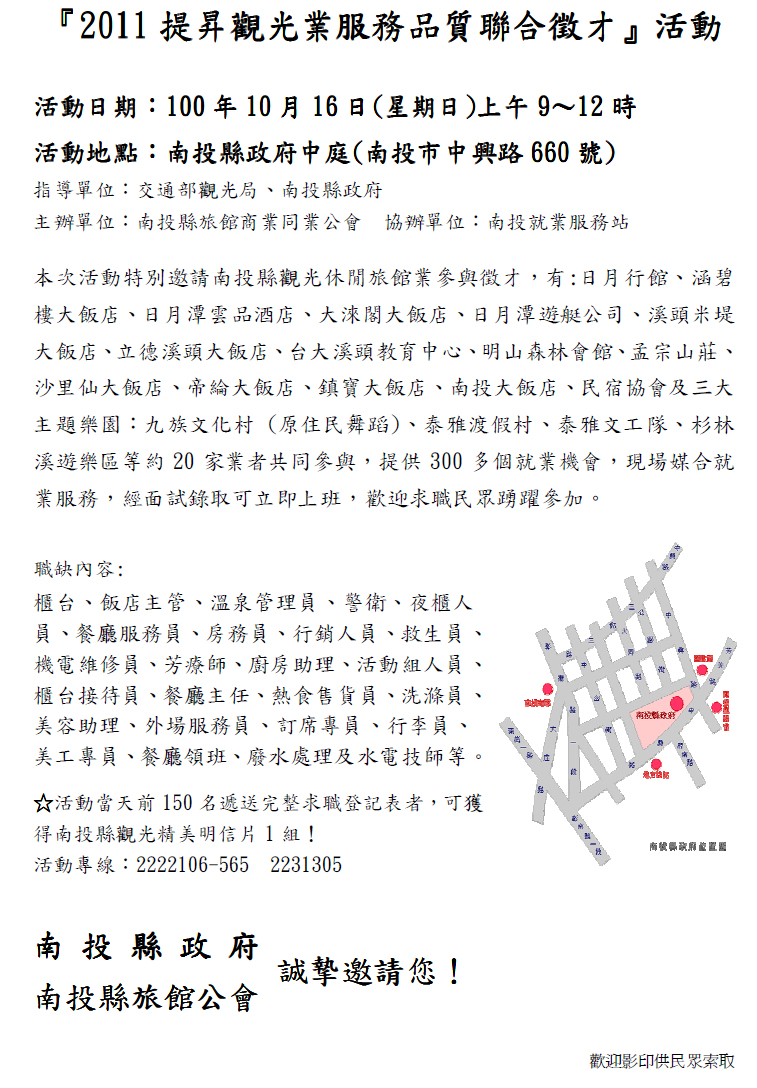 為協助本縣觀光產業求得適當人才以提昇服務品質,特訂100年10月16日於南投縣政府中庭(南投市中興路660號),舉辦