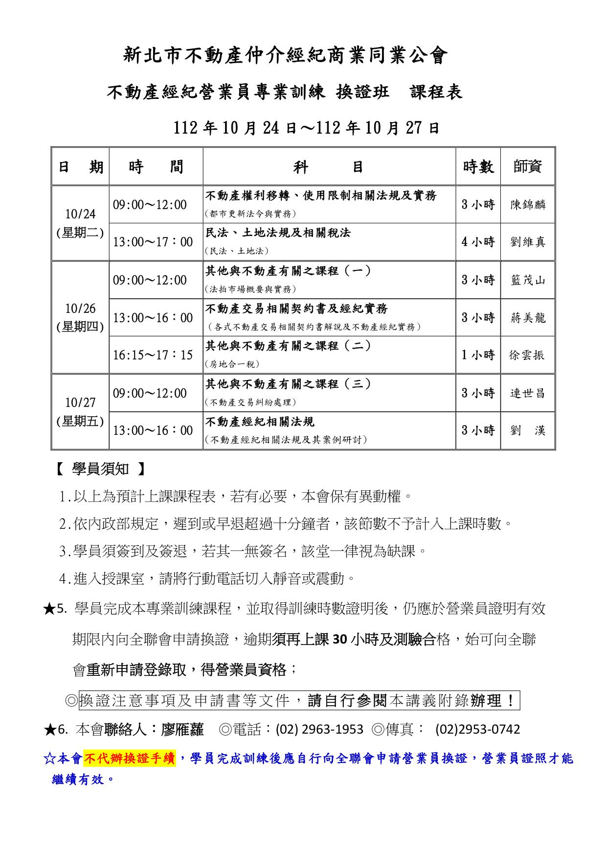 » 112年10月不動產經紀營業員專業訓練換證班(複訓)