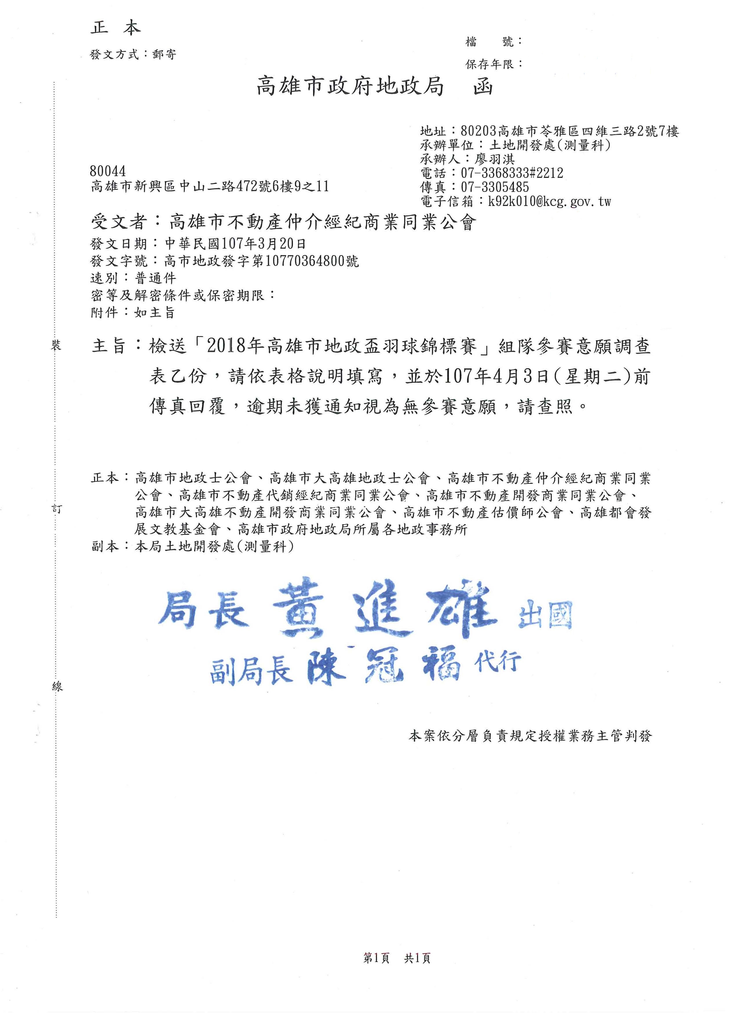 發文日期:2018/03/28 發文組織:高雄市不動產仲介經紀商業同業公會
