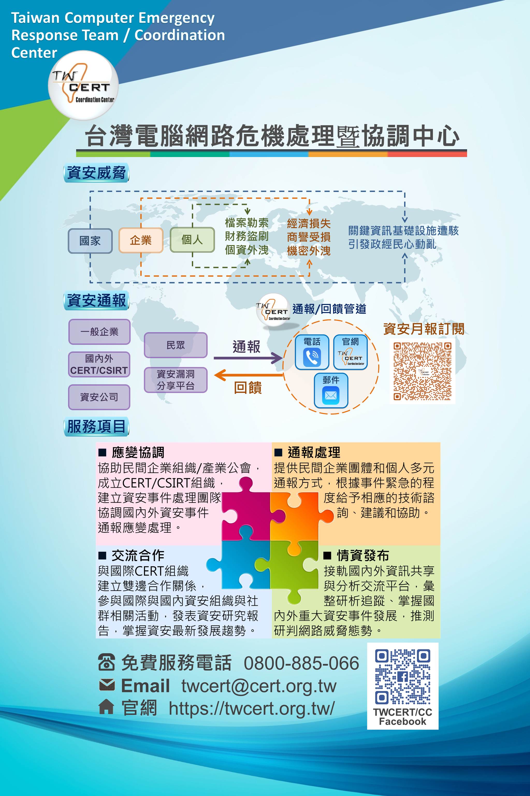 與世界各國CERT互惠合作及情資共享,加速國際跨境資安事件通報與協處。