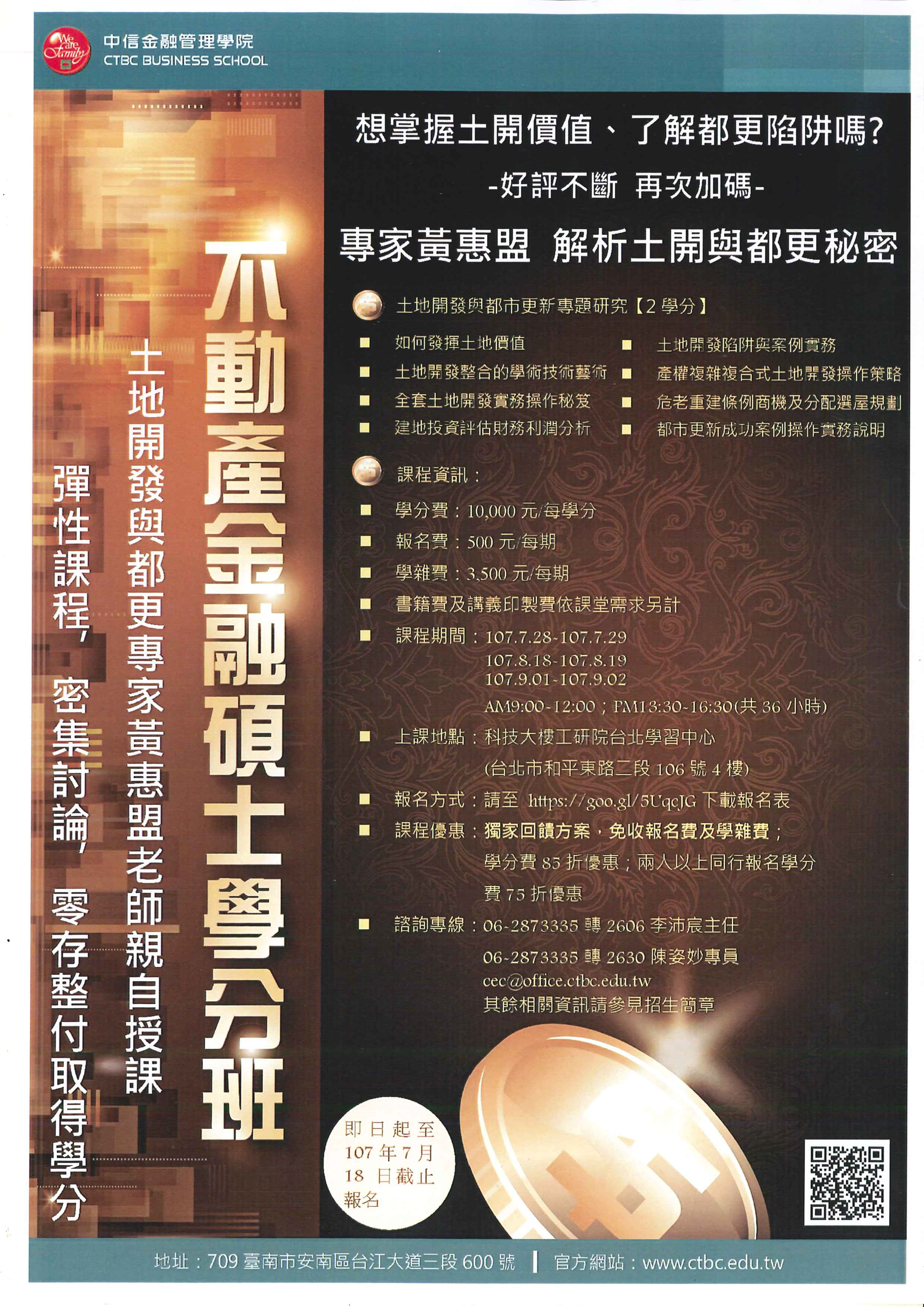 辦理「不動產金融碩士學分班:土地開發與都市更新專題研究」招生