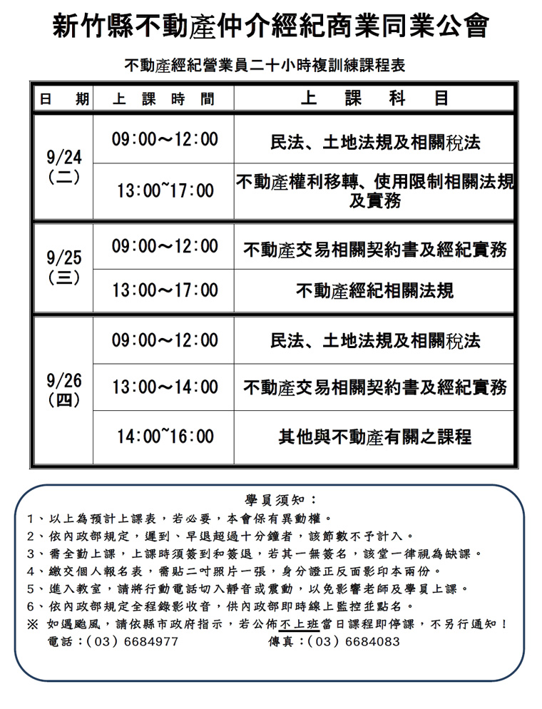 新竹縣不動產仲介經紀商業同業公會 電話:03-6684977 傳真:03-6684083 地址:302新竹縣竹北市嘉興路338巷30號 電子郵件信箱