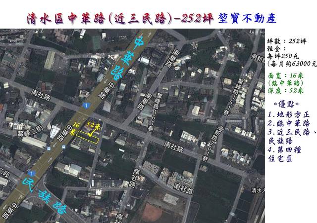 - 詳細資料 ‧位置 :台中市清水區中華路(近三民路) ‧坪數 :252坪 ‧面寬 :16米 ‧深度 :52米 ‧租金 :每月6.3萬元 ‧分區 :第四種住宅區 ‧建蔽率 :55% ‧容積率 : 200% 土地敘述 本筆土地為出租,每坪租金250元(每月約63000元) 位於清水區中華路,臨近三民路、民族路, 交通便捷,正臨中華路,出入方便。 坪數適當,地形方正,自用及投資皆宜。 意者請洽堃寶不動產 04-26283355 官網http://www.cb1050.com 臉書https://www.facebook.com/clean365533