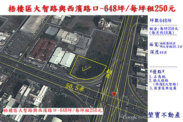 - 詳細資料 ‧位置 :台中市梧棲區文昌路與建國東街角地 ‧坪數 :648坪 ‧面寬 :44~50.5米 ‧深度 :44米 ‧租金 :每月16萬元 ‧分區 :第三種商業區 ‧建蔽率 :80% ‧容積率 : 500% 土地敘述 本筆土地為出租,每坪租金250元(每月約16萬元) 位於梧棲區大智路與西濱路口,正角地! 交通便捷,商業區用地,使用用途廣, 歡迎超商及大型商場BOT合作案接洽。 意者請洽堃寶不動產 04-26283355 官網http://www.cb1050.com 臉書https://www.facebook.com/clean365533